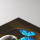 Composition of round steampunk clock with black Roman numeral dial, decorated with gold and brass gears, blue Morpho butterflies and damaged lenses on brown striped background. Steampunk style.