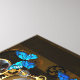 Composition of round steampunk clock with black Roman numeral dial, decorated with gold and brass gears, blue Morpho butterflies and damaged lenses on brown striped background. Steampunk style.