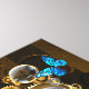 Composition of round steampunk clock with black Roman numeral dial, decorated with gold and brass gears, blue Morpho butterflies and damaged lenses on brown striped background. Steampunk style.