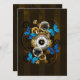 Composition of round steampunk clock with black Roman numeral dial, decorated with gold and brass gears, blue Morpho butterflies and damaged lenses on brown striped background. Steampunk style.