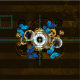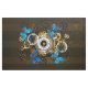 Composition of round steampunk clock with black Roman numeral dial, decorated with gold and brass gears, blue Morpho butterflies and damaged lenses on brown striped background. Steampunk style.