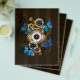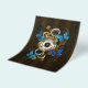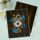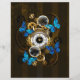 Composition of round steampunk clock with black Roman numeral dial, decorated with gold and brass gears, blue Morpho butterflies and damaged lenses on brown striped background. Steampunk style.
