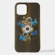 Composition of round steampunk clock with black Roman numeral dial, decorated with gold and brass gears, blue Morpho butterflies and damaged lenses on brown striped background. Steampunk style.