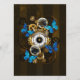 Composition of round steampunk clock with black Roman numeral dial, decorated with gold and brass gears, blue Morpho butterflies and damaged lenses on brown striped background. Steampunk style.