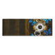 Composition of round steampunk clock with black Roman numeral dial, decorated with gold and brass gears, blue Morpho butterflies and damaged lenses on brown striped background. Steampunk style.