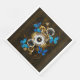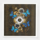 Composition of round steampunk clock with black Roman numeral dial, decorated with gold and brass gears, blue Morpho butterflies and damaged lenses on brown striped background. Steampunk style.