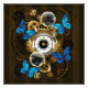 Composition of round steampunk clock with black Roman numeral dial, decorated with gold and brass gears, blue Morpho butterflies and damaged lenses on brown striped background. Steampunk style.