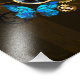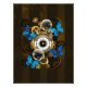 Composition of round steampunk clock with black Roman numeral dial, decorated with gold and brass gears, blue Morpho butterflies and damaged lenses on brown striped background. Steampunk style.