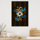Composition of round steampunk clock with black Roman numeral dial, decorated with gold and brass gears, blue Morpho butterflies and damaged lenses on brown striped background. Steampunk style.