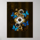 Composition of round steampunk clock with black Roman numeral dial, decorated with gold and brass gears, blue Morpho butterflies and damaged lenses on brown striped background. Steampunk style.