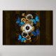Composition of round steampunk clock with black Roman numeral dial, decorated with gold and brass gears, blue Morpho butterflies and damaged lenses on brown striped background. Steampunk style.