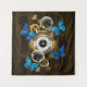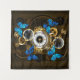 Composition of round steampunk clock with black Roman numeral dial, decorated with gold and brass gears, blue Morpho butterflies and damaged lenses on brown striped background. Steampunk style.