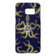 This tentacled steampunk sea monster has eight wire-like gold appendages, a central silver gear and plenty of gears and bolts making up its head, eyes and suction cups. It's a robot octopus / kraken, a metal machine monster for anyone who likes geeky science-fiction / fantasy creatures. On this phone case, tentacles also reach inward from the corners. The background is deep blue.