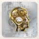 Conceptual, mechanical, human head with antique manometer and metal gears against grey industrial background. Steampunk style.