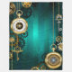 Jewellery, gold watch with a gold chain and keys on a green textural background. Steampunk style.