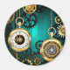 Jewellery, gold watch with a gold chain and keys on a green textural background. Steampunk style.