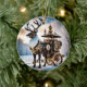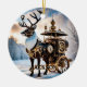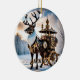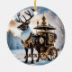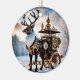 This fun design has a steampunk reindeer pulling a wheeled metal cart.
