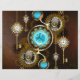 Turquoise lenses with an antique watch with brass gears and golden keys on rusty, brown background. Steampunk style.