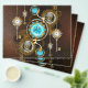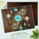 Turquoise lenses with an antique watch with brass gears and golden keys on rusty, brown background. Steampunk style.