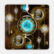 Turquoise lenses with an antique watch with brass gears and golden keys on rusty, brown background. Steampunk style.