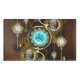 Turquoise lenses with an antique watch with brass gears and golden keys on rusty, brown background. Steampunk style.