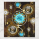 Turquoise lenses with an antique watch with brass gears and golden keys on rusty, brown background. Steampunk style.