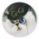 Long haired siamese cat portrait wearing a steampunk top hat with goggles and a glass monocle.