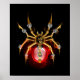 Mechanical, steampunk spider with gold, brass gears and a red glass lamp on a black background. Steampunk style.