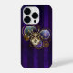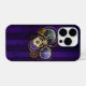 Steampunk spider made of gold and steel with antique watches decorated with gold gears on purple, striped, textured background with lenses and brass gears. Steampunk style.