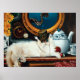 White furry steampunk cat wearing his cute brown top hat and goggles. The cat is sitting on a counter top in the ship's kitchen waiting for his tea time. Behind him is the ship's window that has an octopus passing by.