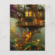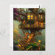 Beautiful postcard created using AI rendering software features a Steampunk style treehouse and observatory with domed rooms and round windows.
