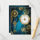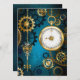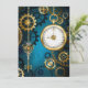 Turquoise, textured, steampunk background with brass and gold gears, a silver key and the clock. Steampunk style.