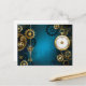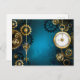 Turquoise, textured, steampunk background with brass and gold gears, a silver key and the clock. Steampunk style.