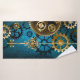 Turquoise, textured, steampunk background with brass and gold gears, a silver key and the clock. Steampunk style.