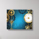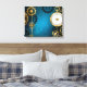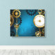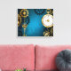 Turquoise, textured, steampunk background with brass and gold gears, a silver key and the clock. Steampunk style.