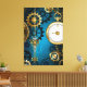Turquoise, textured, steampunk background with brass and gold gears, a silver key and the clock. Steampunk style.