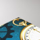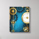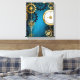 Turquoise, textured, steampunk background with brass and gold gears, a silver key and the clock. Steampunk style.