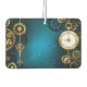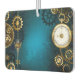 Turquoise, textured, steampunk background with brass and gold gears, a silver key and the clock. Steampunk style.