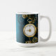 Turquoise, textured, steampunk background with brass and gold gears, a silver key and the clock. Steampunk style.
