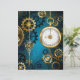 Turquoise, textured, steampunk background with brass and gold gears, a silver key and the clock. Steampunk style.
