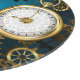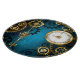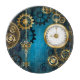 Turquoise, textured, steampunk background with brass and gold gears, a silver key and the clock. Steampunk style.