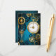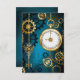 Turquoise, textured, steampunk background with brass and gold gears, a silver key and the clock. Steampunk style.