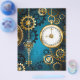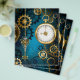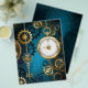 Turquoise, textured, steampunk background with brass and gold gears, a silver key and the clock. Steampunk style.