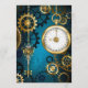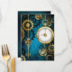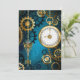 Turquoise, textured, steampunk background with brass and gold gears, a silver key and the clock. Steampunk style.