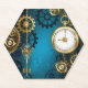 Turquoise, textured, steampunk background with brass and gold gears, a silver key and the clock. Steampunk style.