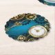 Turquoise, textured, steampunk background with brass and gold gears, a silver key and the clock. Steampunk style.