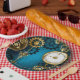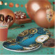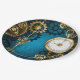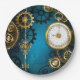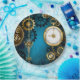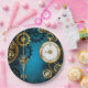Turquoise, textured, steampunk background with brass and gold gears, a silver key and the clock. Steampunk style.