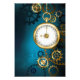 Turquoise, textured, steampunk background with brass and gold gears, a silver key and the clock. Steampunk style.