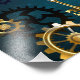 Turquoise, textured, steampunk background with brass and gold gears, a silver key and the clock. Steampunk style.