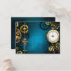 Turquoise, textured, steampunk background with brass and gold gears, a silver key and the clock. Steampunk style.